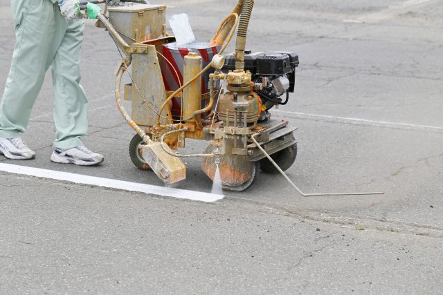 ライン施工機を使い、経験豊富なスタッフが丁寧にラインを引いていきます。
